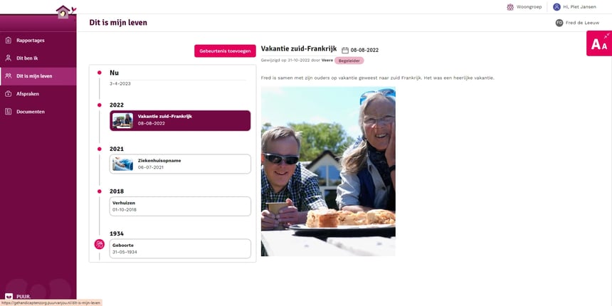 In het onderdeel 'Dit is mijn leven' kun je in de vorm van een tijdlijn de meest belangrijke gebeurtenissen en herinneringen over je leven of over het leven van degene voor wie je zorgt inzien: