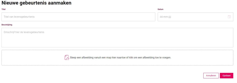 Door op 'gebeurtenis toevoegen' te klikken, kun je zelf een gebeurtenis toevoegen. Vervolgens geef je de gebeurtenis een titel, een bijbehorende datum en je voegt een beschrijving toe. Daarnaast is het ook mogelijk om foto's of andere bijlagen toe te voegen aan de gebeurtenis. Je kunt een gebeurtenis altijd bewerken of verwijderen.