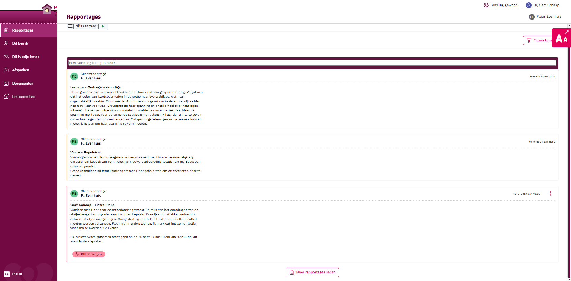 Je werkt daadwerkelijk mee in het dossier. Vanuit deze pagina kun je namelijk zelf een rapportage of een afspraak toevoegen die voor de zorgverleners direct inzichtelijk is. Naast rapportages, zie je aan de linkerzijde in het beeldscherm de verschillende menu onderdelen van PUUR. van jou staan.