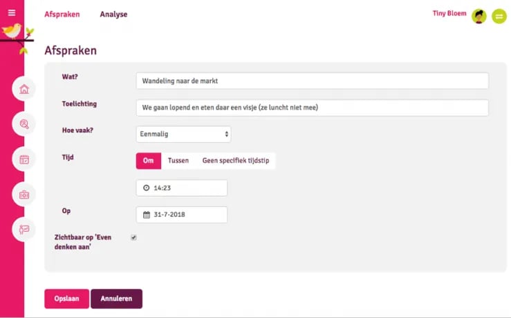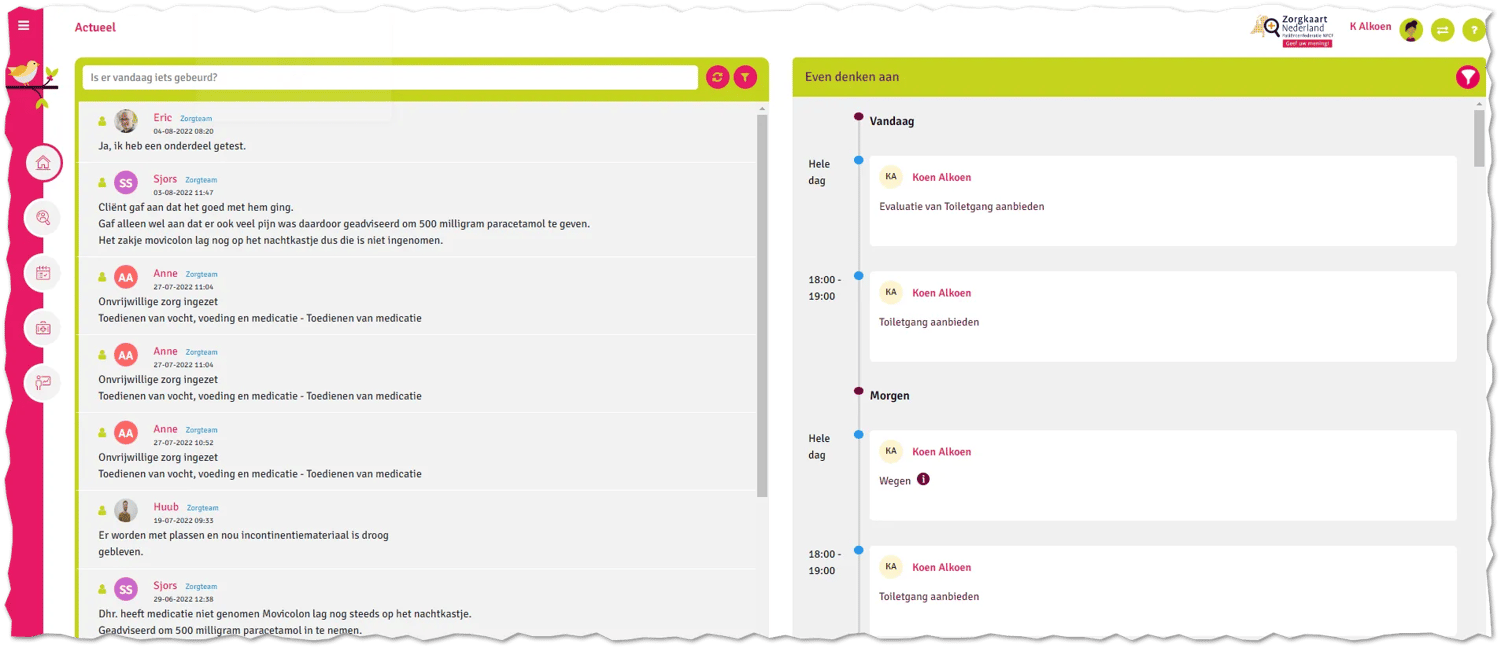 De Even denken aan-lijst aan de rechterzijde van de 'Actueel' pagina toont de afspraken voor vandaag. Dit kunnen afspraken zijn van het team: bijv. een teamoverleg tussen zorgverleners of een glazenwasser die komt of afspraken van jou zelf of van de persoon waarvan je mantelzorger bent. Sommige afspraken kun je oppakken/ overnemen. Ook kun je nieuwe afspraken toevoegen.
